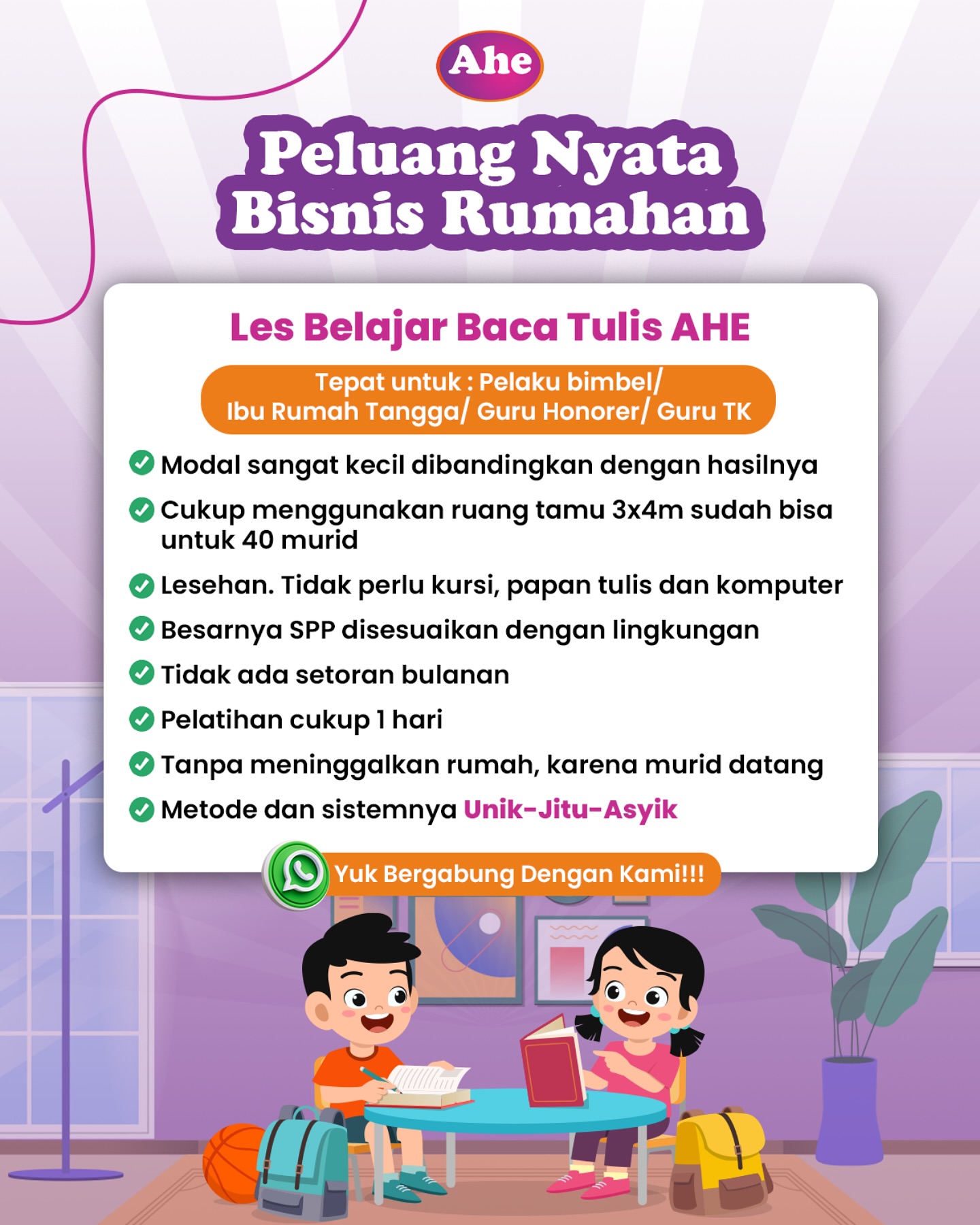 Saya Fitri Rahayu, seorang ibu rumah tangga berdomisili di Bantul – Yogyakarta, Pemilik Bimbel Rumah Belajar Rahayu sebagai Mitra AHE. Dimulai 5 tahun lalu, saya bermitra dengan Lembaga Pendidikan Anak Hebat Indonesia – AHE. Awal merintis memaksimalkan ruang tamu untuk tempat belajar. Seiring waktu usaha bimbel berkembang, saat ini bimbel sudah memiliki tempat representatif untuk belajar dan bisa menampung siswa lebih banyak. Alhamdulillah saya sudah memilik 4 unit AHE dan keuangan saya SANGAT BAIK!